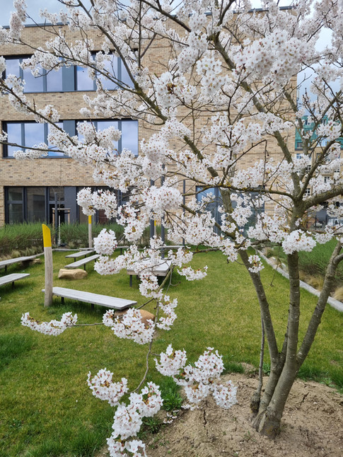 Während in den bereits fertiggestellten Bereichen des Schulzentrums Gerichtsweg die ersten Zierkirschen blühen,