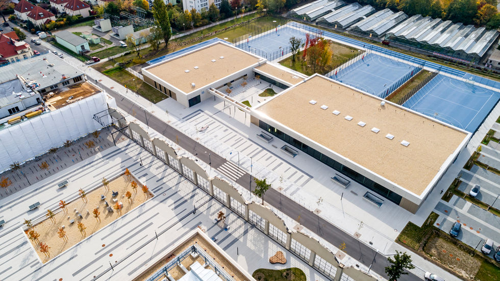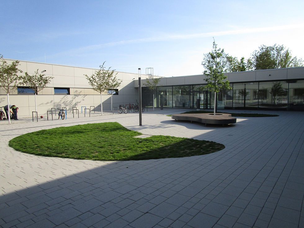 Leitidee ist es, den Schulstandort in Verbindung mit den neuen Baulichkeiten und den verbleibenden Fassadenelementen des historischen Straßenbahnhofes als in sich geschlossenen Campus herauszuarbeiten und dabei gleichzeitig mit seiner Umgebung zu verknüpfen. Die unmittelbare Freifläche der Schule unterteilt sich in den historischen Eingangsvorplatz des ehemaligen Straßenbahnhofes, den großen inneren Pausenhof, die Sportflächen und verbleibende Randflächen (Erschließungszonen, Anlieferung und Grünbereiche). Der Pausenhof spannt sich als gesamthaft wirkende Einheit zwischen den Schulneubauten und den Sporthallen über die Kipsdorfer Straße hinweg auf. Damit wird die trennende Wirkung der Straße gemildert. Angestrebtes Ziel ist daher eine Übernahme der Beläge des Schulhofes auch auf der Straße und dem Gehweg. Prägende Grünelemente dieses Bereiches sind Baumdächer in Verbindung mit locker eingestellten Einzelbäumen. Sie gliedern die Fläche und bilden so einzeln erlebbare Räume bezogen auf Oberschule und Gymnasium in der erforderlichen Größe heraus.