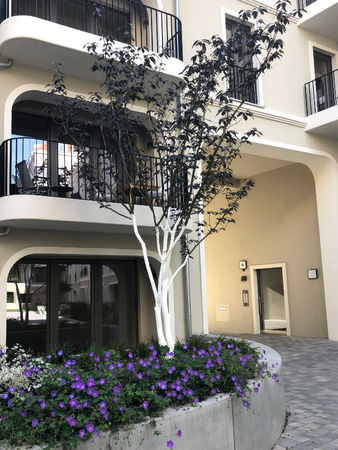 Durch die mittige Anordnung des 5,30m breiten Weges zwischen den Baukörpern ergeben sich entlang der Gebäude verlaufende Grünflächen. Am Zugang Theresienstraße zwischen Haus D und Haus E wird ein Quartiersplatz gestaltet, der als Treffpunkt innerhalb des Areals fungiert. Ein größerer Platz schließt an das Wallgäßchen an. Die Plätze sind mit einer Sitzinsel, die gleichzeitig ein Baumquartier bilden, ausgestattet. Im Bereich zwischen dem Bestandsgebäude und Neubau spannt sich ein Innenhof mit einer 95 m² Spielfläche auf. Zudem erhält der Innenhof von Haus C einen kleinen Sandspielbereich.